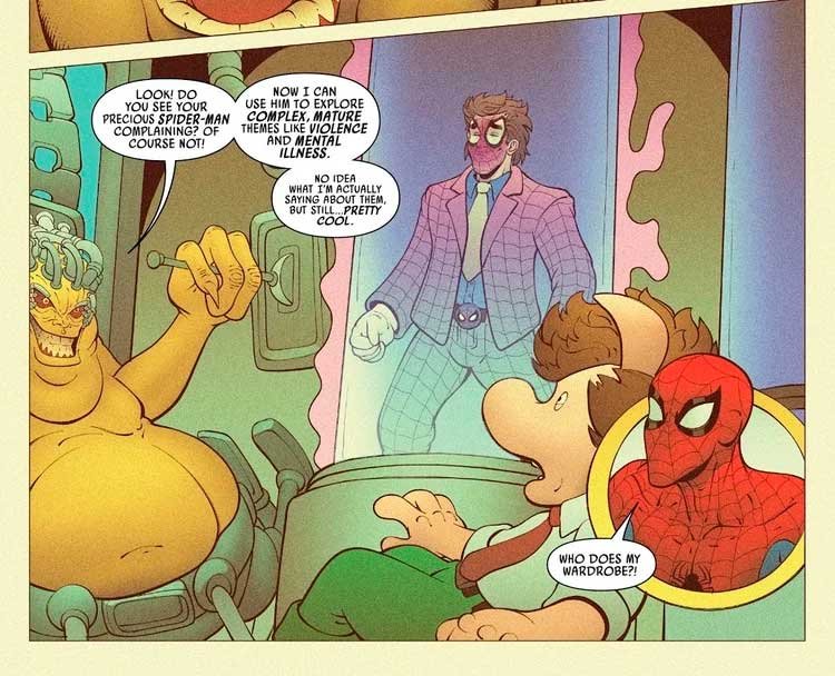 Nas imagens acima, O Homem-Aranha foi mostrado com um terninho vermelho, uma gravata amarela e uma camisa azul, com uma pintura no rosto que parecia vagamente com a máscara do Homem-Aranha. Mojo então observou que ele poderia usar o Homem-Aranha “para explorar temas complexos e maduros, como violência e doença mental”, apesar de não saber o que ele realmente queria dizer sobre qualquer um dos tópicos.